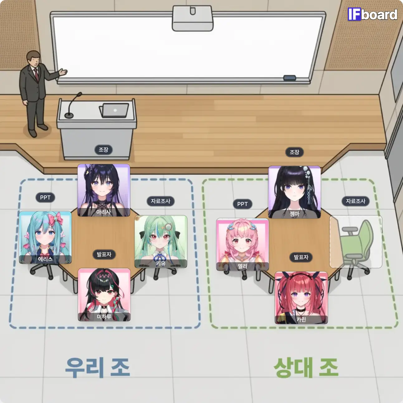 카론유니버스 조별과제를 해야하는데 우리조와 상대조를 만들어봐